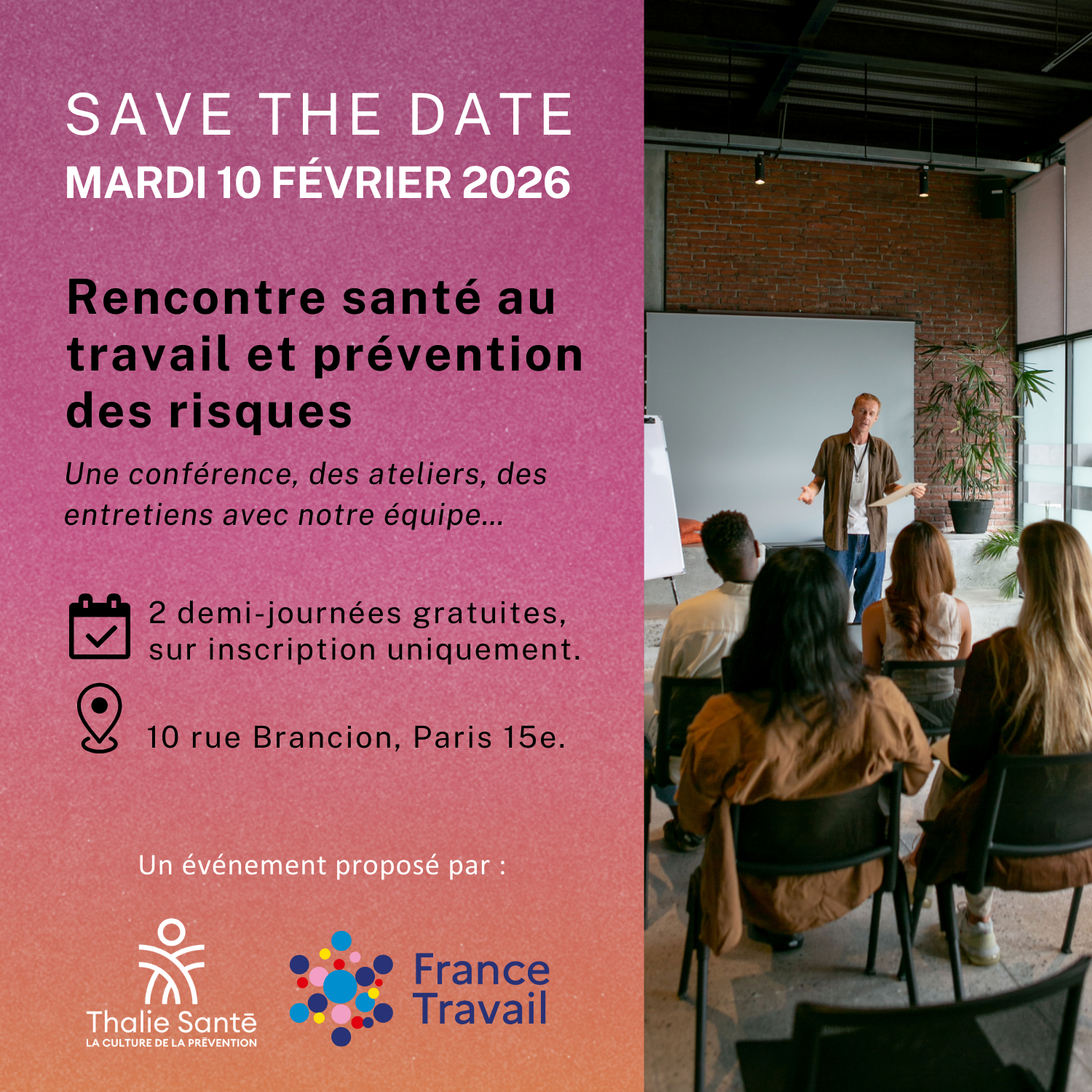 L’agence spécialisée France Travail Audiovisuel Spectacle Artistes et Thalie Santé s’associent pour proposer aux artistes intermittents du spectacle une rencontre santé au travail et prévention des risques dans nos locaux du 10 rue Brancion Paris 15e.